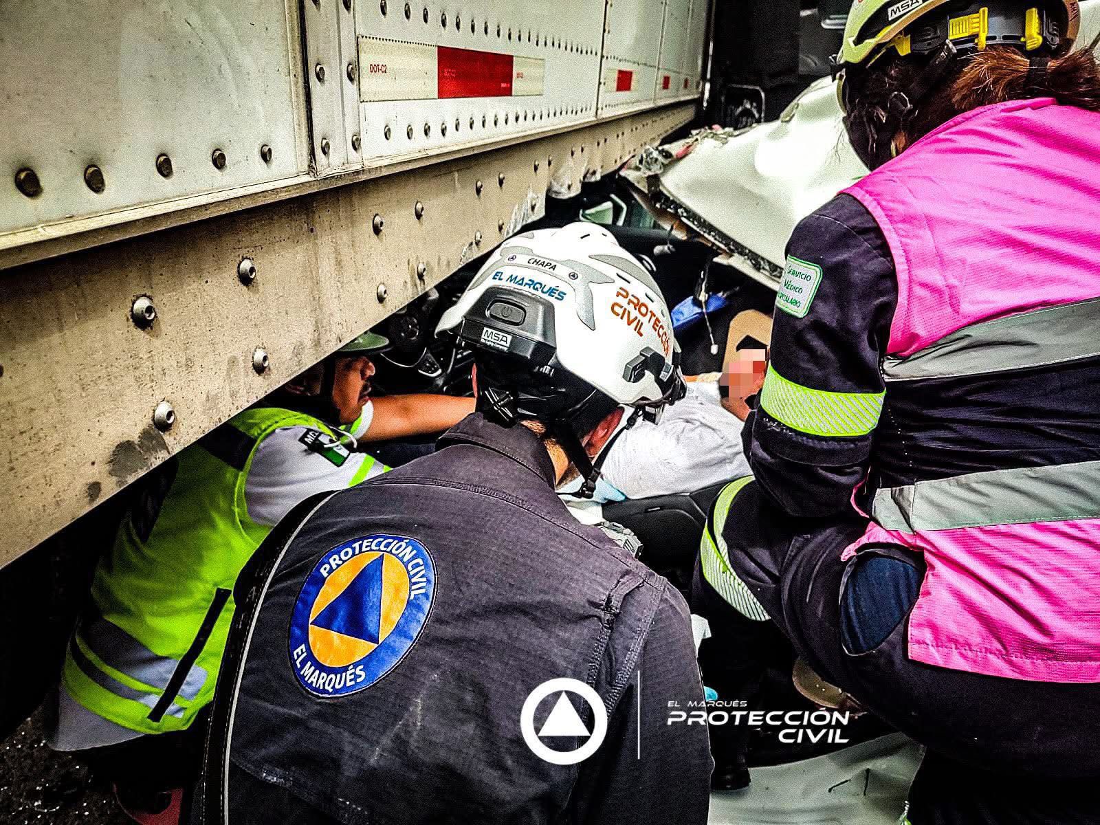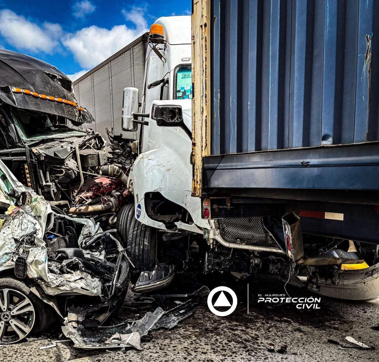 Esta tarde se registró una colisión por alcance sobre la carretera federal 57, con dirección a la Ciudad de México, que involucró tres vehículos de carga pesada y un automóvil particular. Paramédicos de Protección Civil de El Marqués valoraron a cuatro personas: tres presentan lesiones leves y una más, con lesiones de consideración, fue trasladada a un hospital para recibir atención médica. Personal de CAPUFE realizó la extracción de uno de los heridos.