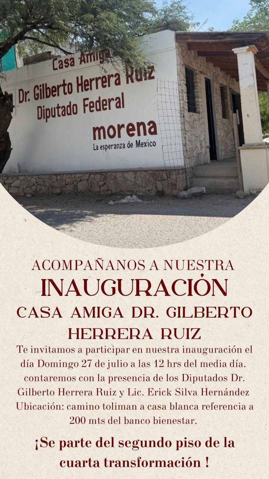 27 DE JULIO DE 2025. Querétaro, Qro.— Este domingo al mediodía, el diputado federal Gilberto Herrera Ruiz inauguró oficialmente la Casa Amiga Dr. Gilberto Herrera Ruiz en el municipio de Tolimán, un espacio que —según declaró— busca acercar el trabajo legislativo y la Cuarta Transformación a la población del semidesierto queretano.