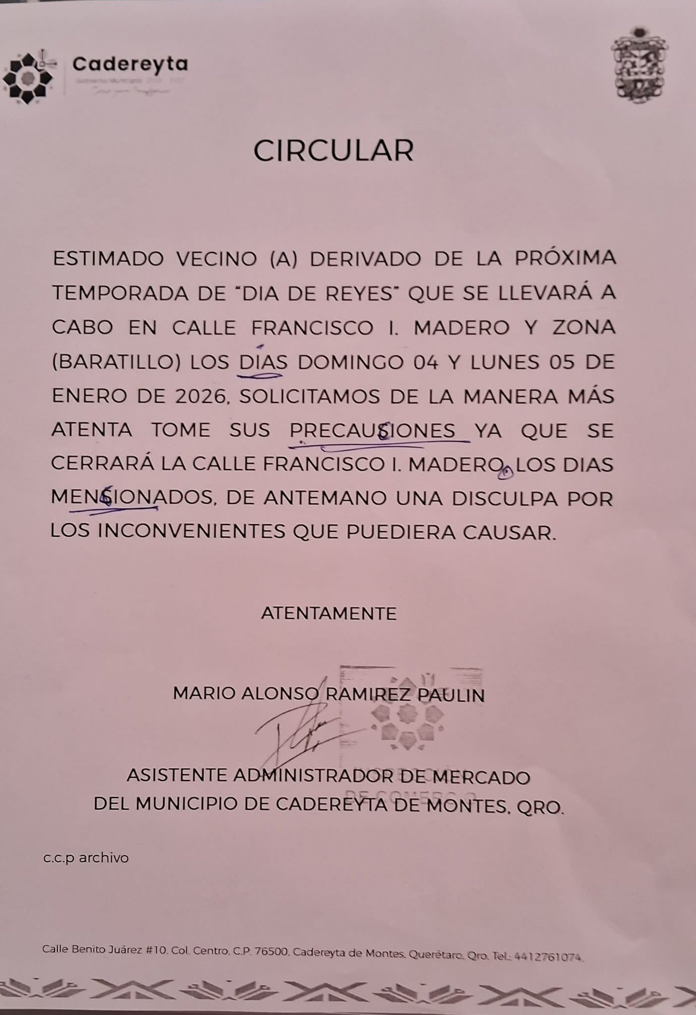 🟡 El aviso, relacionado con el cierre de la calle Francisco I. Madero por la temporada de Día de Reyes, presenta fallas evidentes como el uso incorrecto de palabras clave, entre ellas “MENSIONADOS”, en lugar de mencionados, así como “PRECAUSIONES”, escrita de forma errónea en un llamado que, de manera contradictoria, exhorta a la ciudadanía a tomar precauciones.