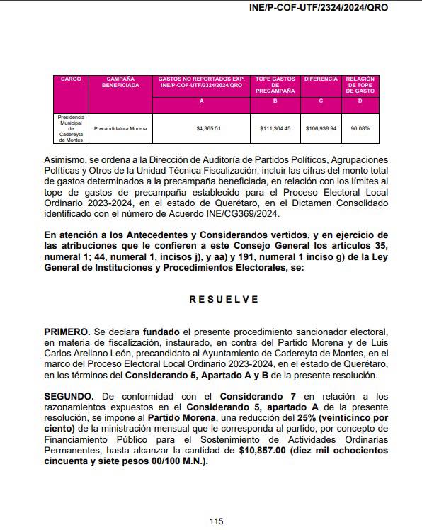 ⚖️ En consecuencia, el INE declaró fundado el procedimiento sancionador e impuso a Morena una sanción consistente en la reducción del 25 por ciento de una ministración mensual de su financiamiento público ordinario en Querétaro, hasta alcanzar un monto de 10,857 pesos.