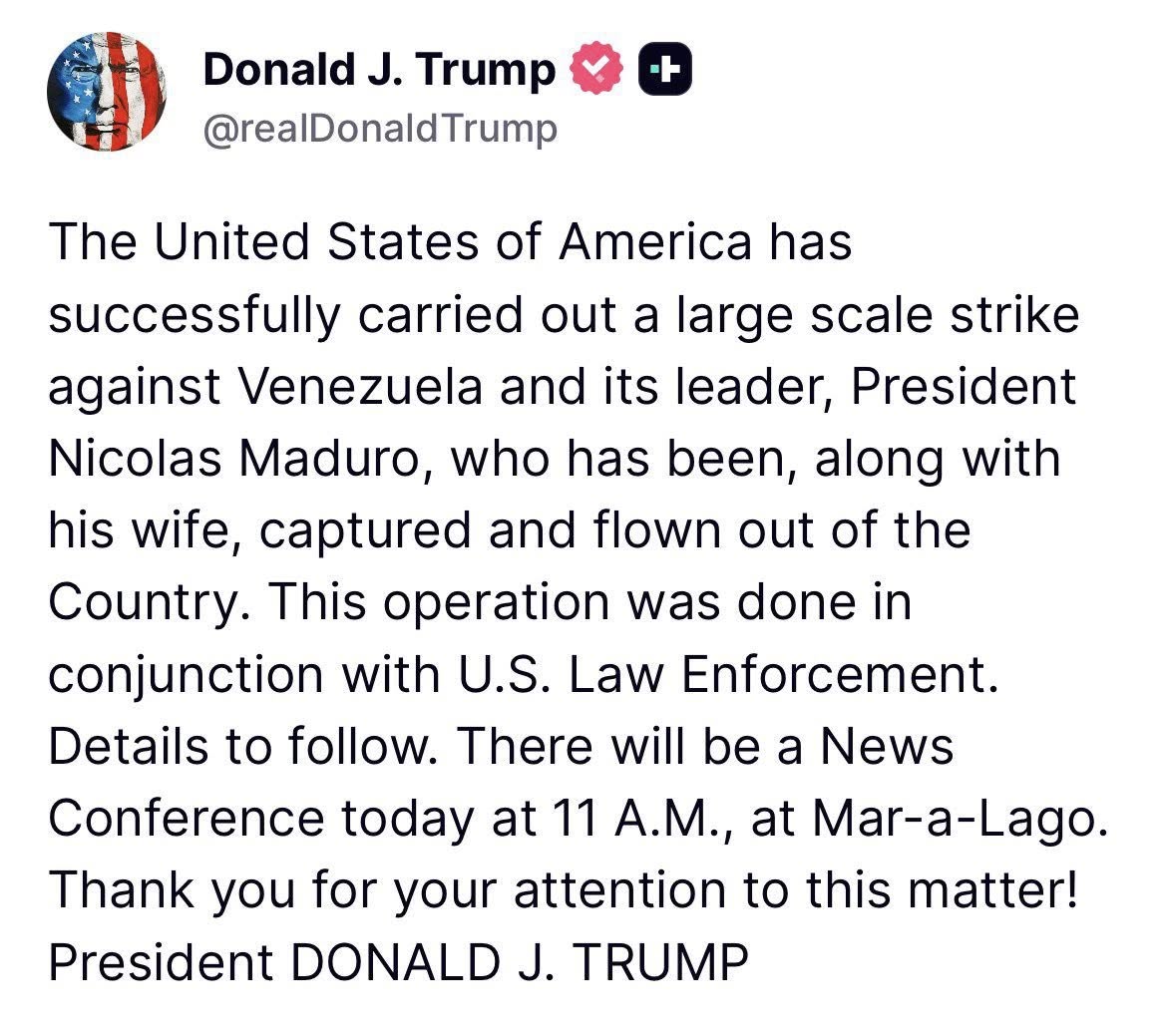 📣 Más tarde, el presidente de Estados Unidos, Donald Trump, publicó un mensaje en el que afirmó que Estados Unidos realizó un ataque “a gran escala” y que Nicolás Maduro y su esposa habrían sido capturados y trasladados en avión fuera del país, además de anunciar una conferencia de prensa a las 11:00 horas en Mar-a-Lago.